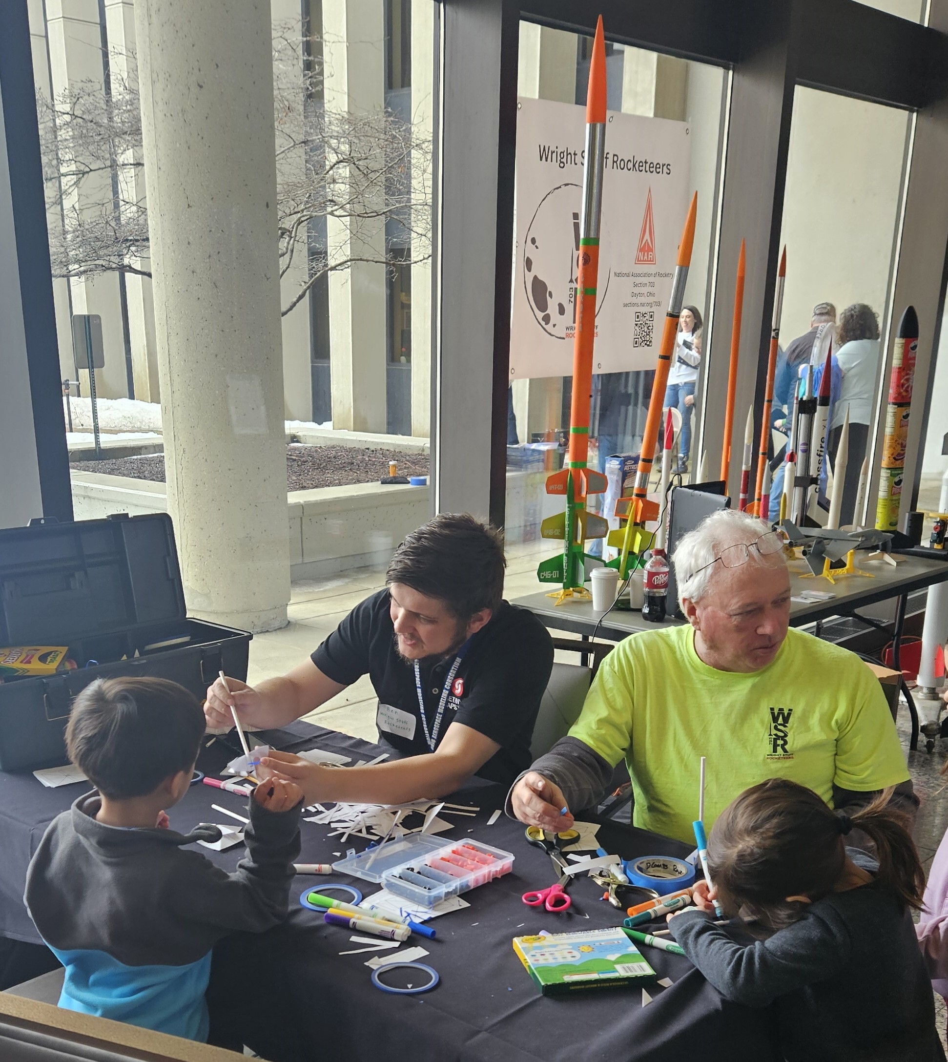 The Great Hall at Sinclair Community College were humming with STEM students on Saturday February 15 and Sunday February 16. Wright Stuff Rocketeers and eRockets was there in force manning one of the largest booths showing off model rocketry, but also hosting a build session and flying each day, and building and flying air rockets, and firing the motor test stand for anyone who wanted to experience the excitement of solid propellent rocket motors.